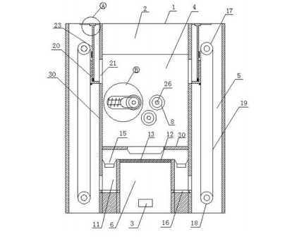新型土壤修復裝置將破碎箱劃分為不同的腔體,使土壤修復裝置在土壤在破碎時,能夠在破碎腔內進行破碎操作,出料腔將破碎后的土壤排出,進入下一工序。而回料腔則將不能被破碎的大塊土壤重新通過傳送裝置運送到破碎腔內,重新進入破碎工序,防止了大塊土壤進入到下一工序,使土壤在修復過程中能夠與修復劑充分混合,從而提高了修復效率。